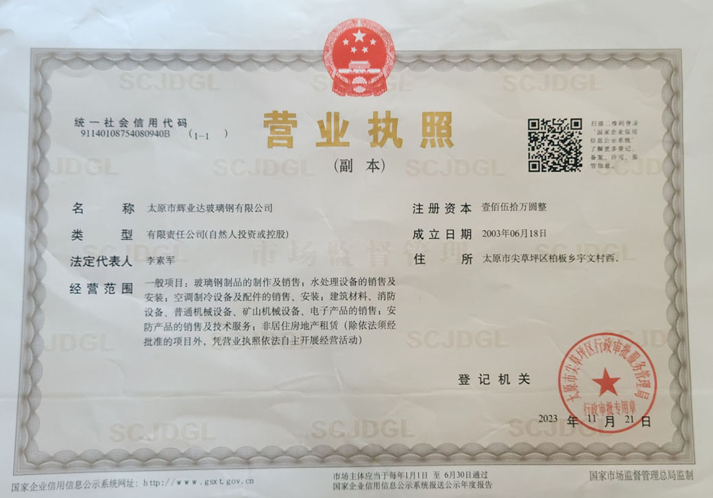 太原市輝業達玻璃鋼有限公司是一家集玻璃鋼科研、生產、銷售與技術服務為一體的多元化公司。同時備有一支高素質的員工隊伍,團結而智慧的管理層,科學的管理方法,雄厚的技術實力為企業的發展奠定了基礎,這也是給用戶提供優秀的施工質量,優質的產品和服務的有力保證。